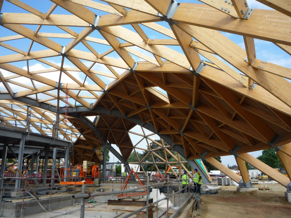Geodesic dome structure made from Glulam timber members connected to steel nodes; each steel node was a bespoke member (over 200 were required). Due to the glulam connections, tolerance was a key issue (+0/-1mm). Because the nodes are to be seen once the building is complete and were galvanised no site alterations to the nodes needed to take place, our client was extremely pleased that we achieved this.
